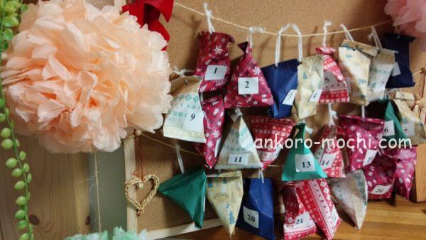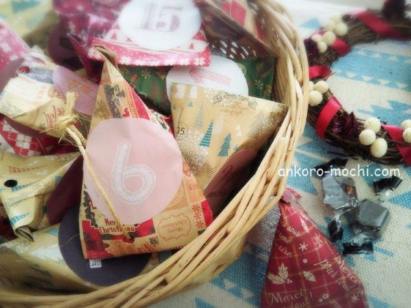 市販のアドベントカレンダーだと、何がでるかお楽しみだけど、手作りは好きなおやつが入れられます。